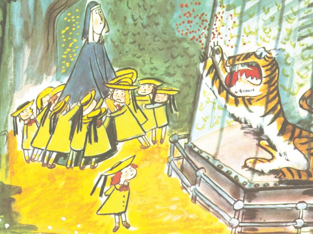 Miss Clavel however, her boarding school caretaker, is extremely prominent, to the point where she tends to start and end books. This is for a few reasons. It establishes the setting: that Madeline lives in a very strict, almost religious household that has rules. It also is a contrast to bring out Madeline’s rambunctious personality. This makes her antics and running off that much more brazen. Most books have Miss Clavel literally chasing Madeline through a city, or looking for her.