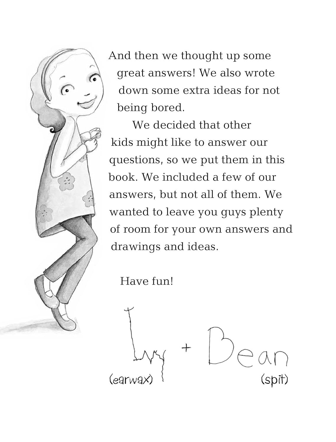 Every page is full of character. I’m pretty sure that first one is the only time we’ve ever seen Ivy’s room apart from book 1. That last page is my favorite in the entire book. The “I would do it again.” prompt is the most Ivy and Bean thing ever. Note how it’s not worded as a question (Would you do it again?). It’s a leading statement intended to make you check “Yes”. Amazing. They even sign the forward in different handwritings. I’m surprised that Bean’s script is better than Ivy’s. Maybe she’s just writing badly on purpose.
