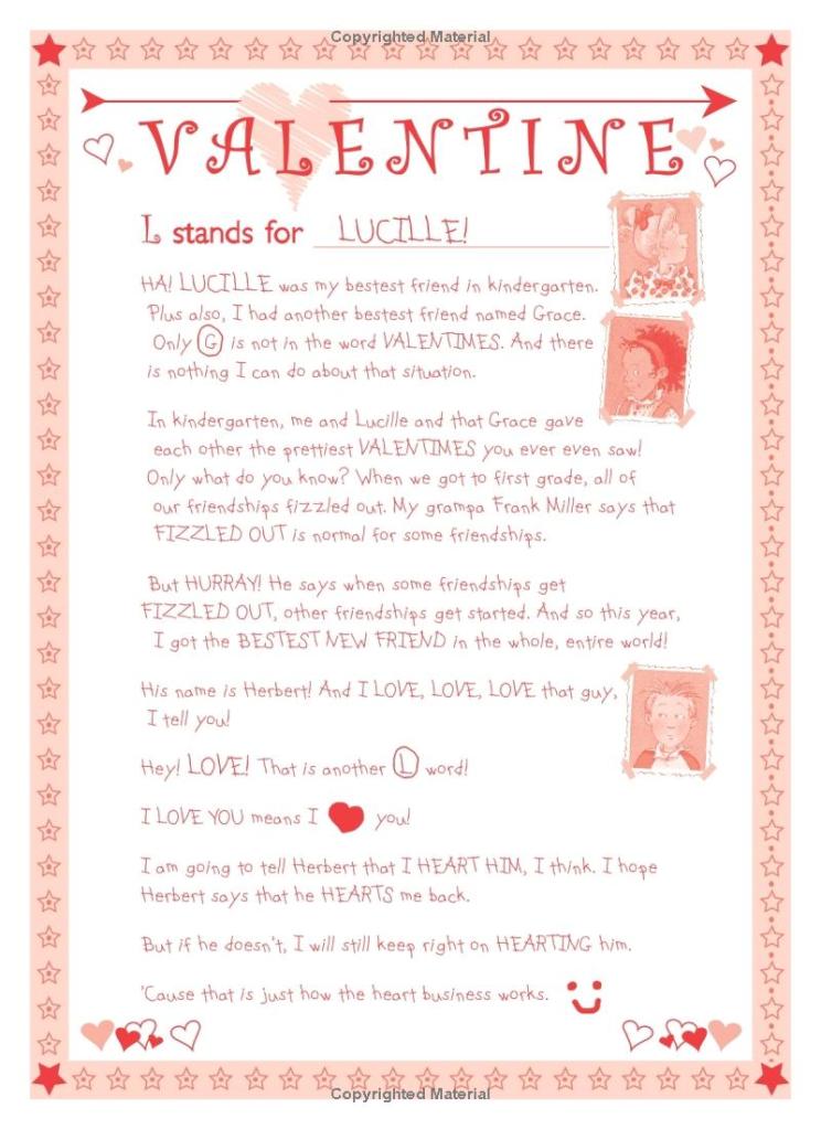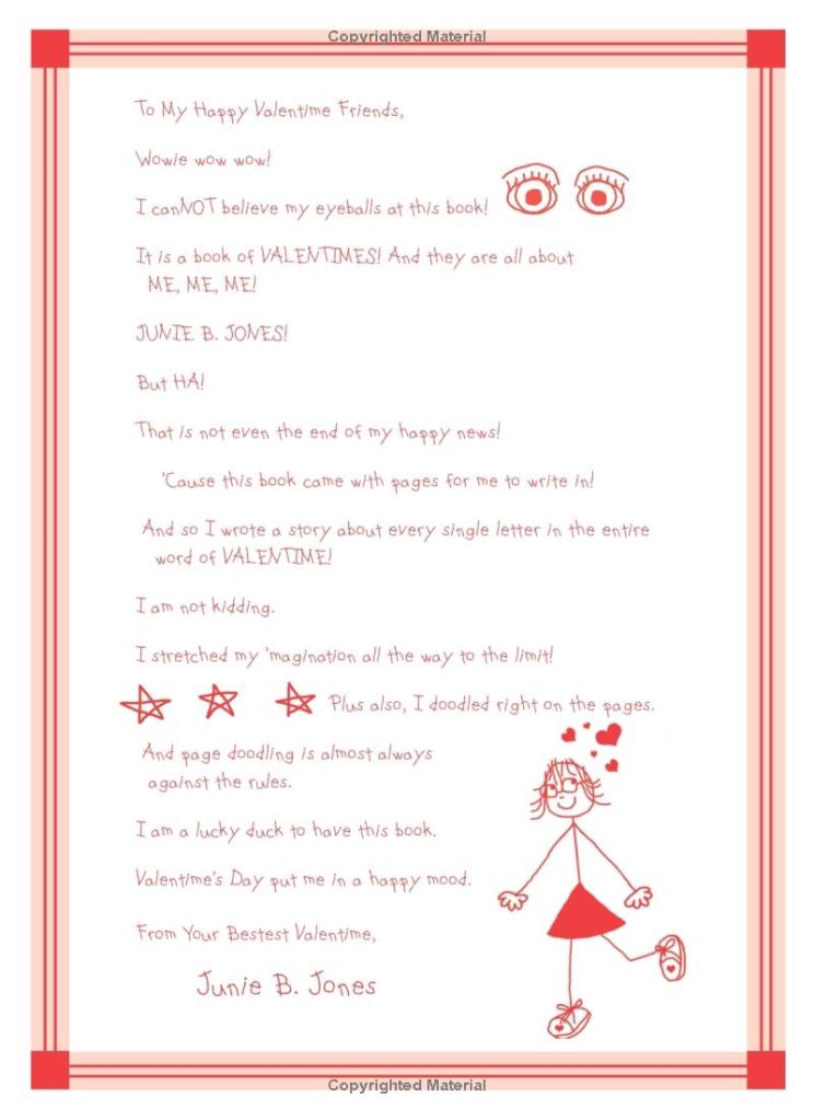 In Valentime, it’s just an extended intro to all the Valentine’s cards in the book. More importantly, for people following Junie, it also confirms that not only Grace, but also Lucille aren’t friends with Junie anymore.
