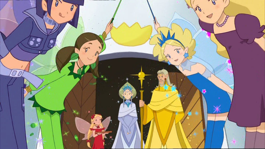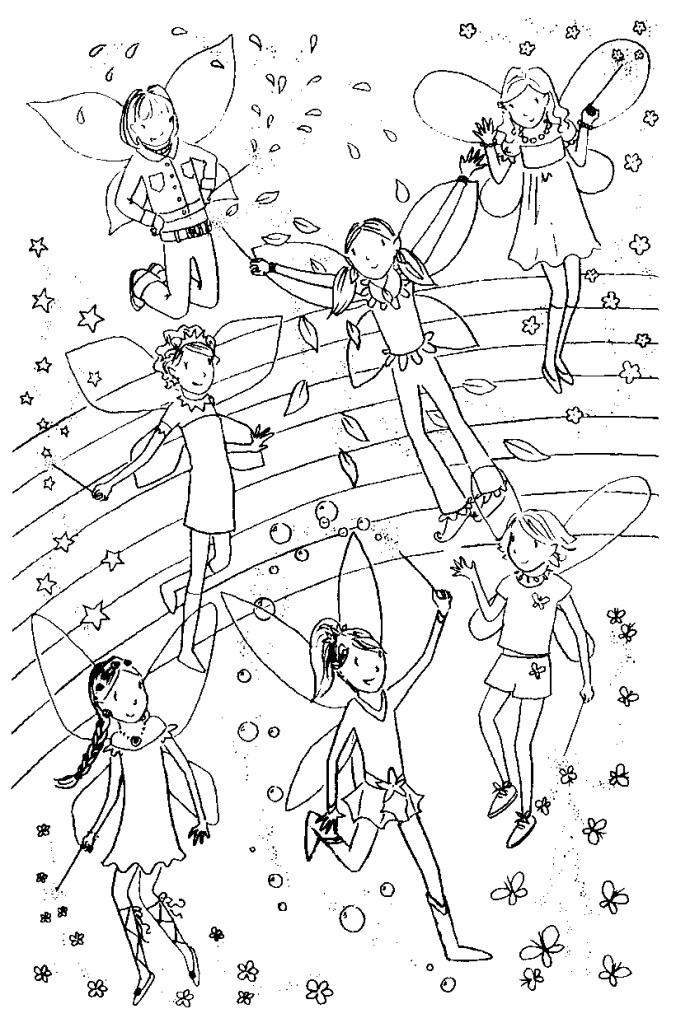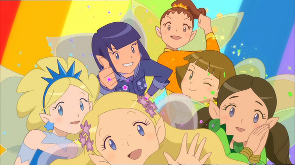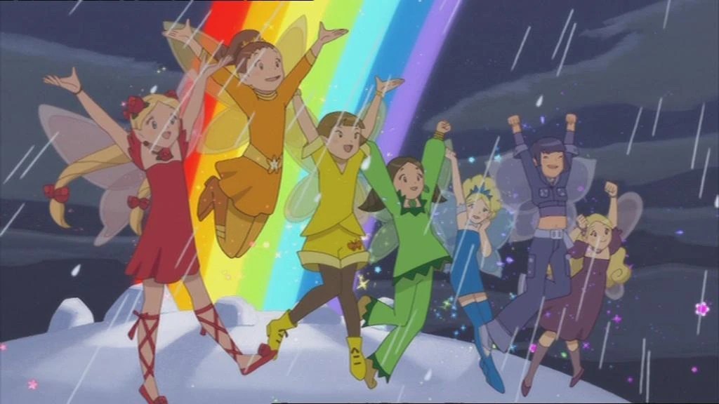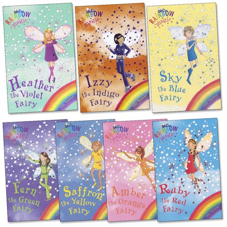 Ruby the red fairy, Amber the orange fairy, Sunny the yellow fairy (UK: Saffron), Fern the green fairy, Sky the blue fairy, Inky the indigo fairy (UK: Izzy), and Heather the violet fairy to be specific. Together they bring color to all of Fairyland.